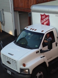 About an hour ago, a big Salvation Army truck began backing gingerly down the (not terribly wide) communal driveway behind our house. I figured the baby would enjoy seeing what was making the beeping noise, so I took him out on the deck to watch.