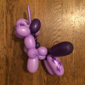 People, I did it. I delivered my kid’s balloon animal order so he could continue obsessing over cake and running around like a lunatic. And the World’s Best Balloon Twister did an awesome job, and the Boo loved that thing. I mean, really loved it. Slept with it. Brought it down for breakfast. Watched My Little Pony with it.