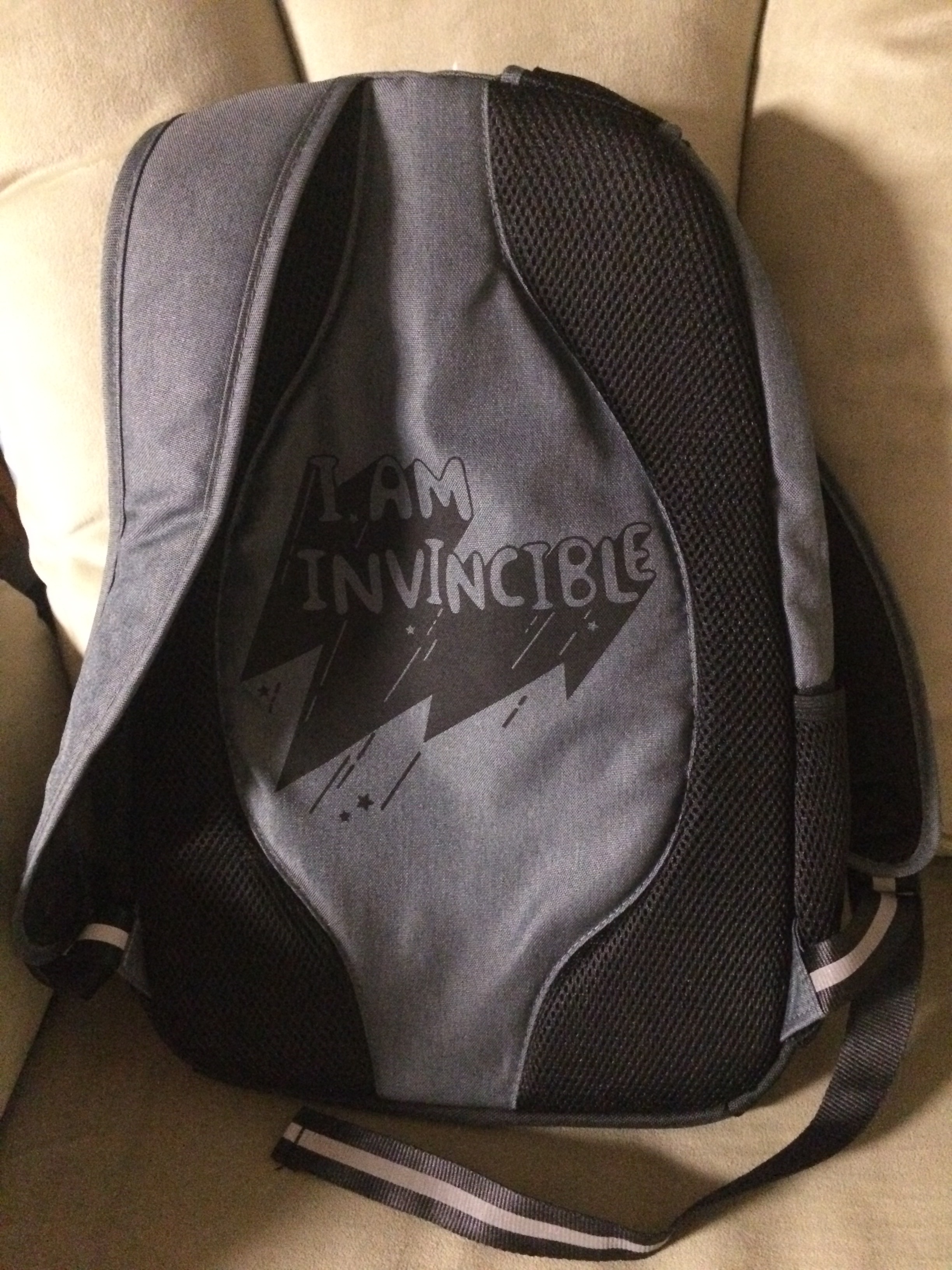 2. I took him to pick out a new backpack because his preschool one is too small to fit a file folder — oh my God do kindergarteners do homework?! Anyway. He was interested in anything but the backpacks, unresponsive when I asked if he liked this one or that one. He’s in denial, I thought, and I patiently put a couple of reasonable choices right smack in front of him. He chose one with outer space stuff all over it. Inside, on the part that will rest on his back, it says “I am invincible.”